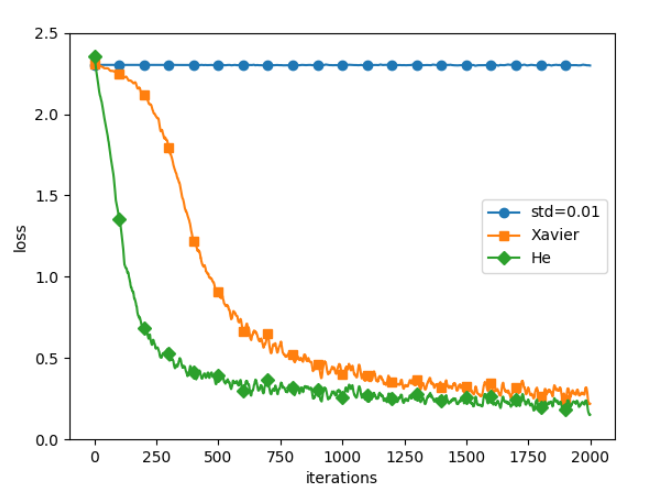 - Xavier 초깃값은 활성화 함수가 선형인 것을 전제로 만들어져 ReLU를 사용할 때에는 부적합하며, He 초깃값을 사용하는것이 적합하다.