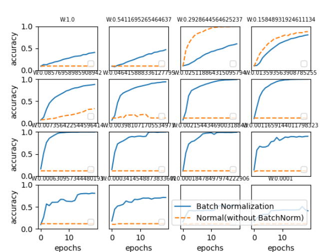 - 실선이 배치 정규화를 사용한 경우 ,점선이 사용하지 않은 경우이다.
