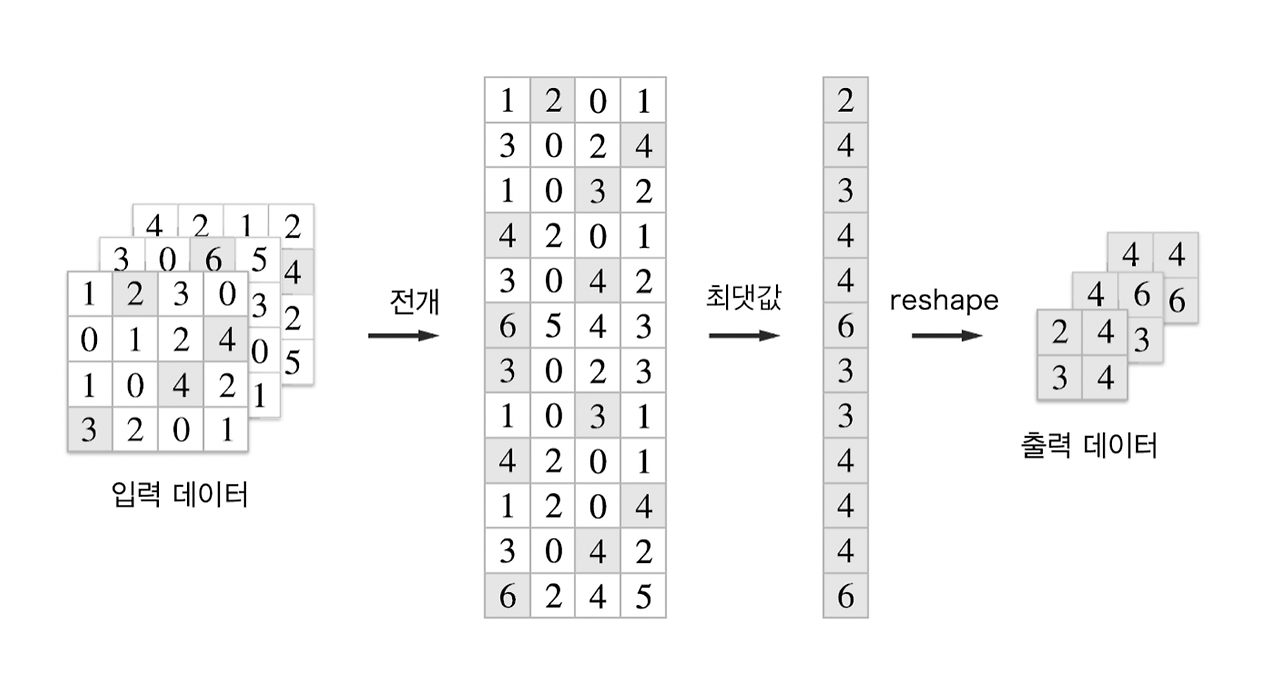 - 풀링 계층 구현의 흐름: 풀링 적용 영역에서 가장 큰 원소는 회색으로 표시