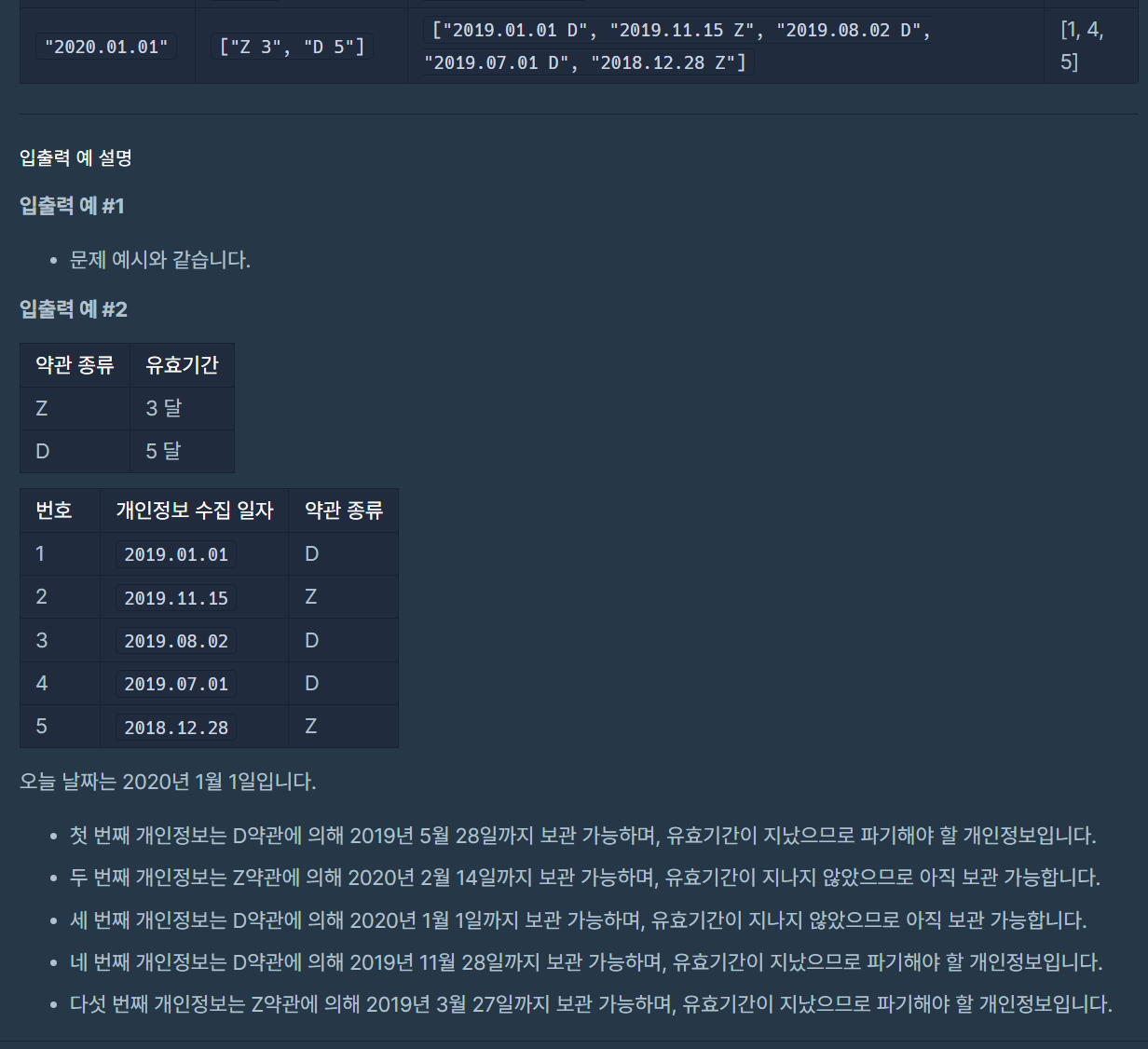 약관을 딕셔너리로 표현했고, 연도,월,일을 배열의 0,1,2번째 원소로 지정해 2차원 배열을 사용했다.