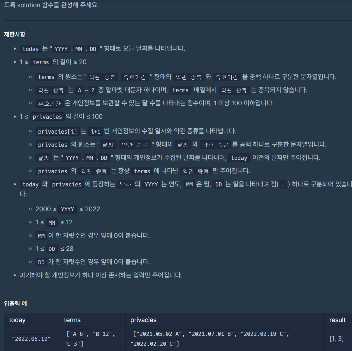 최초에 코드를 다 짜고 나서 정확도가 40%로 테스트케이스를 전부 만족시키지 못해서 어디가 문제인지 찾다가... 조건에 terms의 최대가 20인걸 보고 아차 싶었다. 너무 당연하게 최대를 12로 생각하고 policy_apply함수에서 while문이 아닌 if문으로 짰었던 것이다..